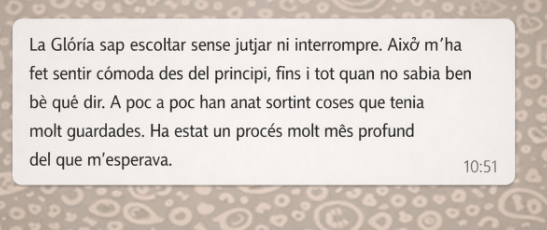 M’agraden les converses que van més enllà de la superfície, el teatre, la música i la literatura que deixen empremta, emocionen i fan pensar. Aquesta manera de mirar el món també és la que porto a la teràpia: un camí fet a quatre mans, amb calma, honestedat i respecte pel ritme de cada persona.