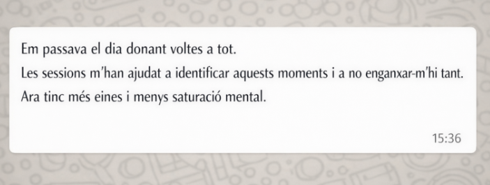 M’ofereixo a acompanyar-te a entendre què t’està generant estrès, com afecta el teu cos, els teus pensaments i el teu dia a dia, i com començar a recuperar un ritme que et respecti.